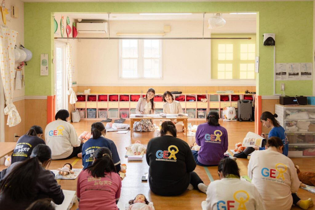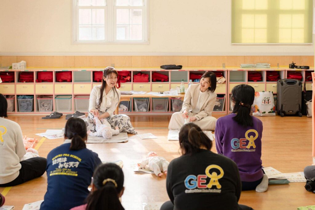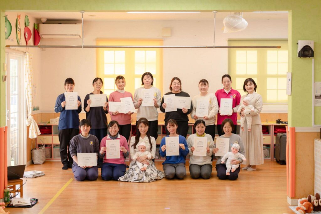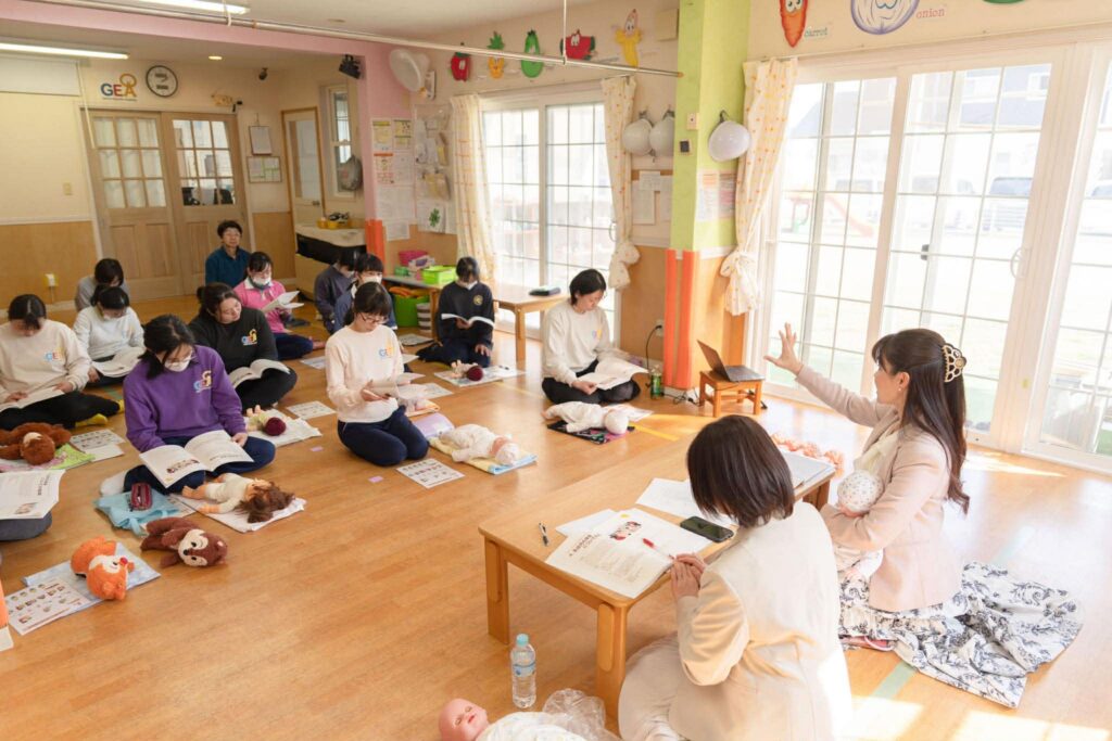 また、会場となったクローバー保育園では、お昼寝から起きたばかりの乳児さんたちが研修に飛び入り参加してくれる場面もありました。 受講者の皆さまには、実際にお子さんと触れ合いながら「なでなであそび」を体験していただく、貴重な実践の時間となりました。